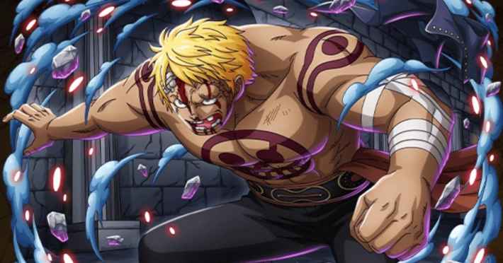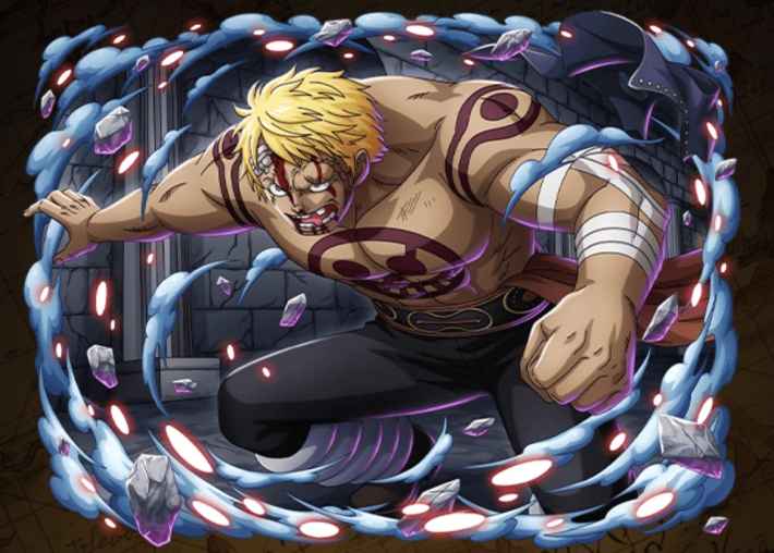 | 敵全体の攻撃を1ターン遅延させ、速属性と野心タイプキャラの必殺ターンを1短縮、一味にかかっているチェイン係数固定状態を5ターン回復し、3ターンの間速属性と野心タイプキャラのスロットの影響を2倍、一味に[ドンキホーテ海賊団]が2人以上いる時、防御力ダウン無効状態異常無効・特定状態異常以外の状態異常無効の効果を無視して1ターンの間敵全体の防御力を0にする |