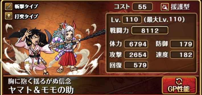 | 一味にかかっている船長効果無効・必殺封じ状態を7ターン回復し、必殺発動時すでにスロット影響増大効果がかかっている時、2ターンの間斬撃と打突タイプキャラの通常攻撃による属性相性の影響を2.75倍、その後2ターンの間斬撃と打突タイプキャラのスロットの影響を3倍にし、3ターンの間「ヤマト&モモの助」になり、一味に[光月家][ワノ国編][動物系幻獣種]が合計5人以上いる時、一味にかかっている攻撃上昇効果とスロット影響増大効果をさらに1.2倍(最大効果値7倍まで。この効果はこの必殺技のスロット影響増大効果にも影響する)、2ターンの間場を「ナワバリ:斬撃タイプ」にする(対象タイプキャラの数に応じて攻撃が最大1.5倍、被ダメージが最大25%減少) |